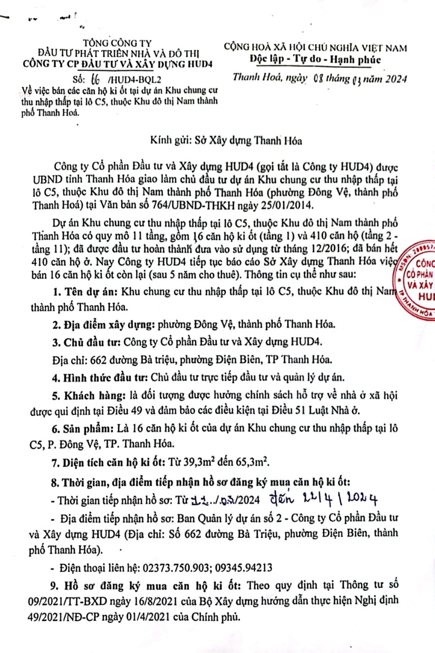 - Thông báo về việc bán các căn hộ ki ốt tại dự án Khu chung cư thu nhập thấp lô C5, thuộc khu đô thị Nam thành phố Thanh Hóa.